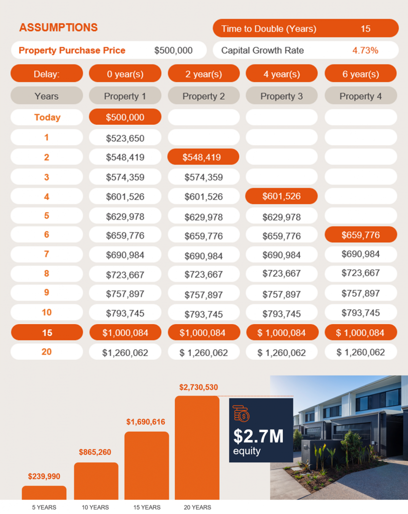 This may seem unachievable, but by buying 4 properties over a 6 year period and holding them for approx 15 years to double in value, you can achieve this. If you are prepared to hold for 20 years then you can target even more affordable properties.